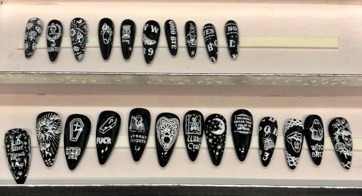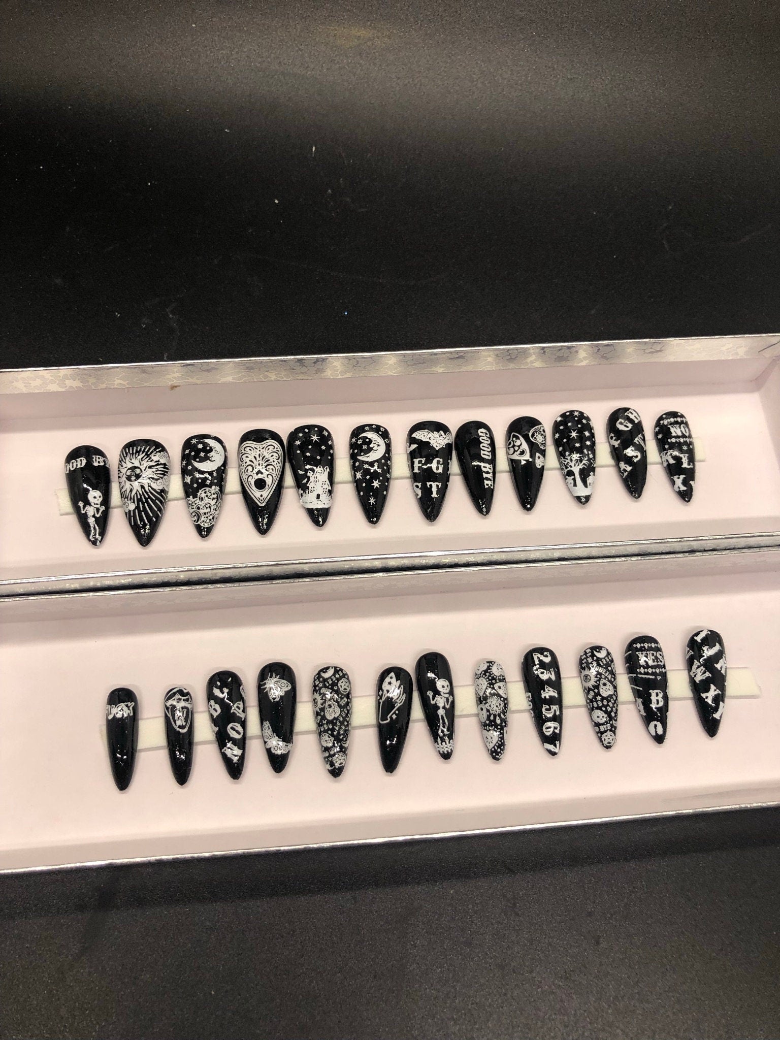 Each set is lovingly handmade as a relaxing creative process, offering you unique nail art at an affordable price. While they may vary slightly from photos, each set maintains the mystical ouija board theme you love.