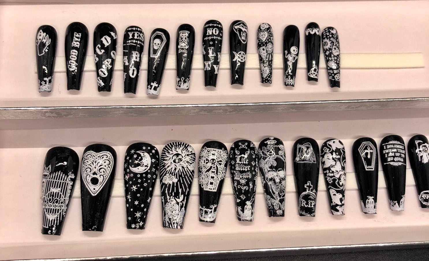 Whether you're attending a gothic event, celebrating Halloween, or just love mystical nail art, these ouija board nails add the perfect supernatural touch to your look. Great for gifts or treating yourself to some witchy glamour.